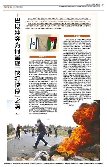 分析人士指出,巴以双方在最新这轮冲突中选择快速停火,既有各自内部的原因,也受到沙特阿拉伯和伊朗复交带来的中东“和解潮”的影响。许多国家看到以武力手段解决分歧矛盾的局限性,以谈促和的势头愈发强劲。巴以问题牵动整个中东地区,涉及多国利益,在“和解潮”背景下,相关各方都不愿进一步升级冲突。
