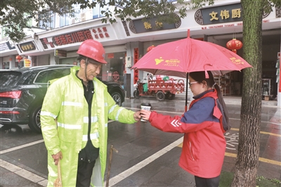 常山县五里中心小学的少先队员将暖意融融的自制奶茶送到环卫工人手里
