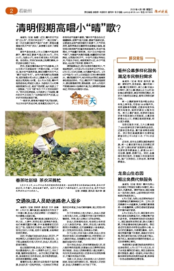 清明假期临近,预计本周我市晴多雨少,气温逐渐回升,今天至4月6日总体多云天气为主。4月2日、3日多云到晴,白天最高气温24℃。4月4日气温9℃~26℃,4日夜里至5日有分散性弱降水。晴好温暖的天气,将为市民出行祭扫、踏青赏春创造良好条件。不过,晴好天气下昼夜温差较大,要注意增减衣物,避免感冒。此外,4月起天气转晴后森林火险等级升高,加之清明祭祀高峰临近,市民务必注意用火安全。