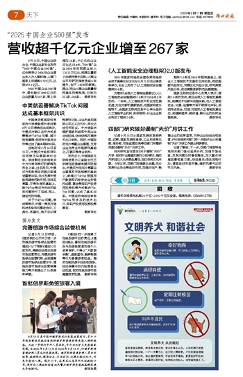 2025中国企业500强中,营收超过1000亿元的企业数量为267家,较上年增加14家,千亿元级企业占比达53.4%。“500强”企业2024年实现营业收入110.15万亿元,规模总量较上年保持增长态势;入围企业平均研发强度连续8年提升,创下1.95%的新高;国企、民企入围企业数量保持基本均衡格局,分别为251家、249家。据新华社