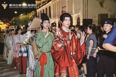 10月1日晚,衢州古城文化旅游区水亭门历史文化街区内举行“浸梦游水亭,双剧巡街福满怀”活动。在《浸梦水亭门》中饰演青帮小弟的演员陈辉身着蓑衣,跟随帮主“巡街”,身边围满了举着手机的游客。“我们将剧中有‘冲突’的情节搬到街头,与游客互动、合影,非常受欢迎。”陈辉说,“每逢大型节假日,我们都会‘巡街’,通过沉浸式互动的形式,带着游客逛一逛水亭门历史文化街区。”