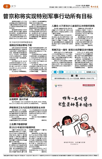 据克里姆林宫网站7日发布的消息,普京当天视察了俄罗斯西北联邦区。他在国防部和武装力量总参谋部领导层会议上说,2025年俄军在特别军事行动中控制约5000平方公里的土地和212个居民点,完全掌握着特别军事行动区的战略主动权。