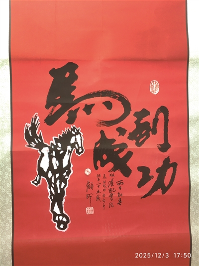 在纪念中国人民抗日战争暨世界反法西斯战争胜利80周年书画展上,他与妻子黄风华共同创作的6件作品成功入选,其中他创作的中国画《小号手之战利品》备受赞誉——画面中,新四军小号手扛着战利品时的纯真笑容,将孩童的天真与战士的英勇完美融合,藏着对胜利的渴望与对希望的坚守,感染力十足。