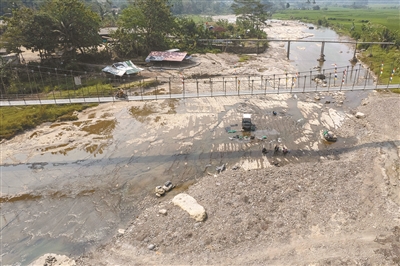8月7日,在印度尼西亚西爪哇省的茂物,乡间一条河流的水量大为减少几近干涸(无人机照片)。 目前印度尼西亚正值旱季。据印尼气象部门预测,受到厄尔尼诺现象的影响,今年印度尼西亚将发生更加严重的旱灾,受灾面积和灾害程度将超过往年。据新华社