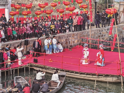 临近春节,杭州市临平区塘栖镇莫家桥村举行传统民俗过大年活动,在水乡河边搭建戏台,上演舞蹈、武术、传统越剧等节目,同时在现场进行打年糕、写春联、做米塑等活动,重现了水乡古镇传统的过年民俗,为即将到来的新春佳节营造浓浓的喜庆气氛。图为2月2日,塘栖镇莫家桥村的村民们在观看传统的水乡社戏。 新华社发