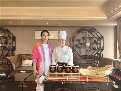 在今年杭州亚运会期间,火炬手郭晶晶品尝了“永君妈妈的那碗面”后,与徐永君合影。